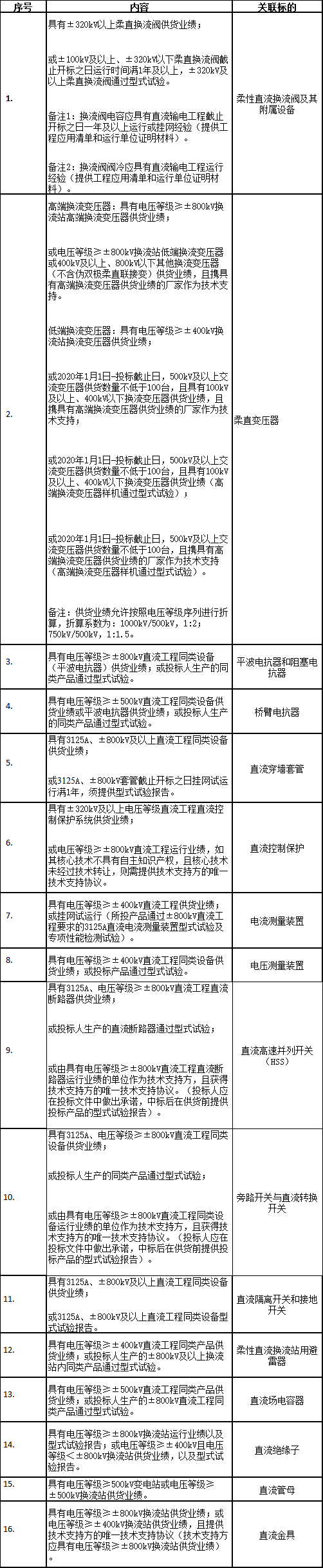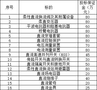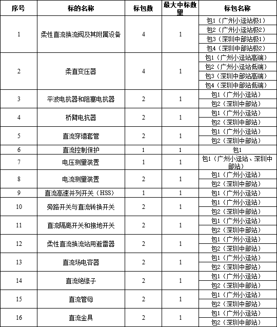 本次招標范圍包括柔性直流換流閥及其附屬設備、柔直變壓器、直流穿墻套管、直流控制保護、電流測量裝置、電壓測量裝置、平波電抗器和阻塞電抗器、橋臂電抗器、柔性直流換流站用避雷器、直流場電容器、旁路開關與直流轉換開關、直流高速并列開關(HSS)、直流隔離開關和接地開關、直流絕緣子、直流管母、直流金具共16個標的,需求單位為超高壓公司。