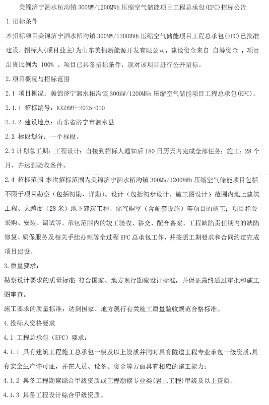 11月11日,山東美錦新能源開發有限公司發布美錦濟寧泗水柘溝鎮300MW/1200MWh壓縮空氣儲能項目工程總承包(EPC)招標公告。